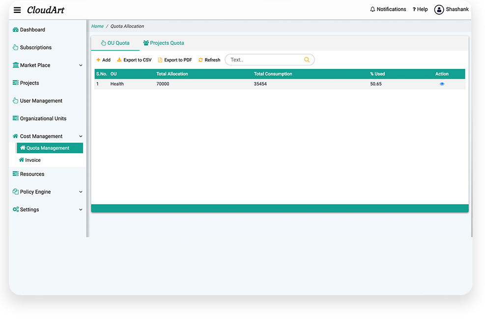 Create Cost guardrails by allocating Budgets and enforcing Governance through an effective monitoring mechanism. Using our Budget tracker and Consumption trend dashboard you can Forecast realistic cloud budgets that you can stick to. Receive notifications and take corrective actions proactively.